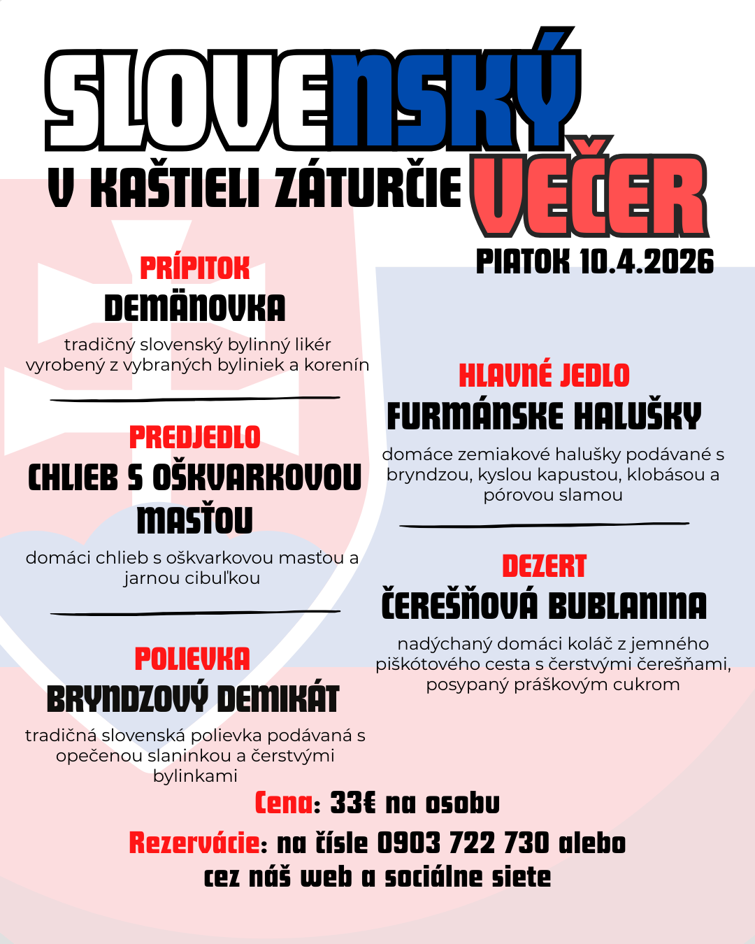 Rezervácie na tel. čísle 0903 722 730 alebo cez naše sociálne siete