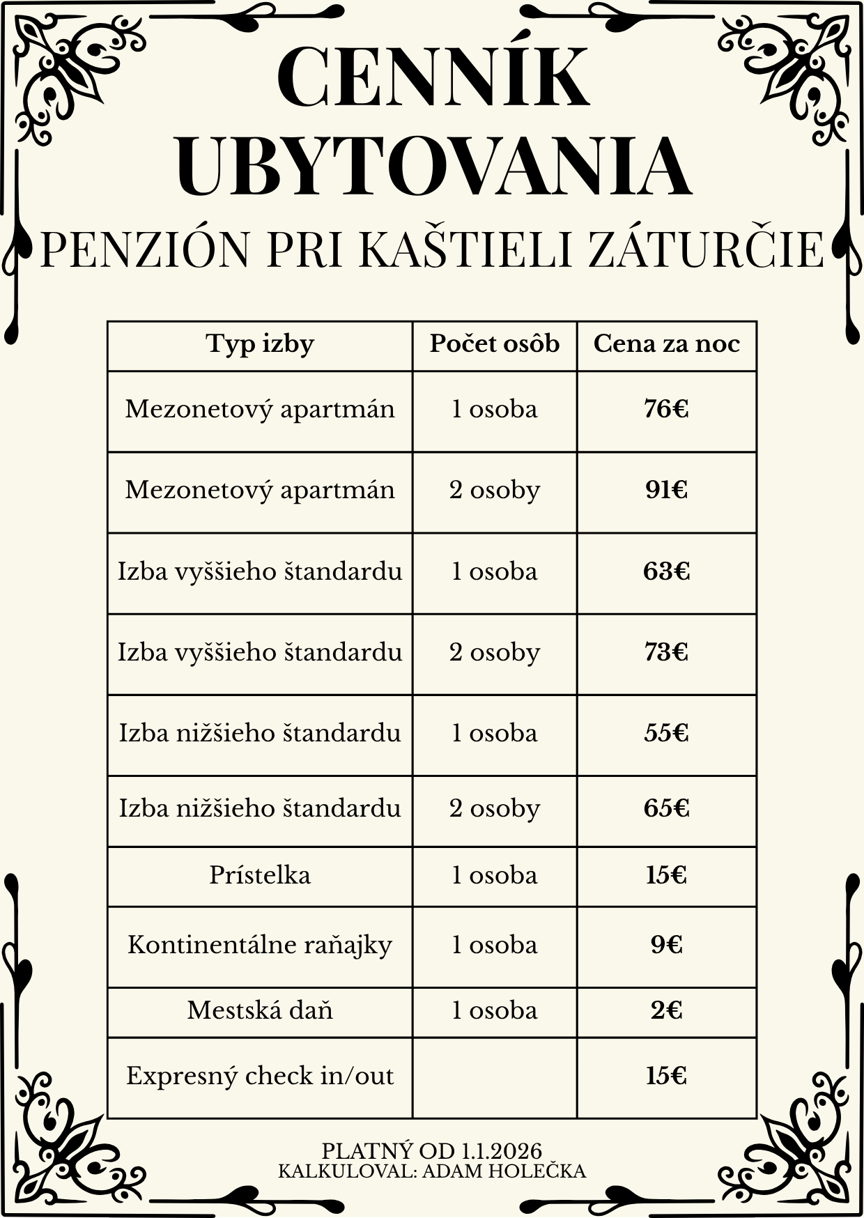 Cenník Recepcia sa nachádza v priestoroch kaštieľa a funguje denne od 15:30 do 21:00 Odhlásenie do 11:00 Odkaz na ubytovanie cez booking.com: Penzión Pri Kaštieli Záturčie Tel. č. : 0903 722 730 0940 546 695